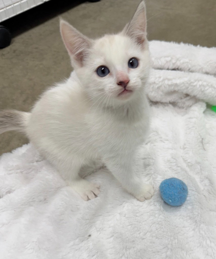 Soft lights, shimmering elegance, and a quiet kind of magic—Glow doesn’t just enter a room, she illuminates it.This ethereal little beauty is draped in a delicate white coat, kissed with a dusting of soft grey like the faintest hint of silver stardust. And then there are her eyes—striking, luminous blue, like camera flashes frozen in time. One look at Glow, and it’s clear: she’s not just red carpet ready—she is the moment.But Glow’s magic isn’t just in her appearance. She has a gentle, radiant spirit that draws you in effortlessly. She’ll tiptoe into your heart with soft purrs, graceful cuddles, and a calming presence that feels like the perfect ending to a long day. Playful when the mood strikes, she dances after toys with quiet delight, then settles in close, content just being by your side.Glow is searching for her forever home—a place where her light can truly shine, where she’ll be cherished like the rare gem she is. If you’re looking for a companion who brings beauty, serenity, and a touch of everyday enchantment, Glow is ready to brighten your world.Adopt Glow—because some stars don’t just shine… they glow. ✨*Kittens under 16 weeks of age must be homed with another cat or adopted in pairs for their social developmentAdoption fee includes:✅ Spay/Neuter✅ Vaccines✅ Microchip✅ Treated for fleas and worms Interested in meeting Glow?Email us at: adoption@columbiahumane.org to request an application.Adoption Fee: $175For more information call 503-397-4353 or email adoption@columbiahumane.org