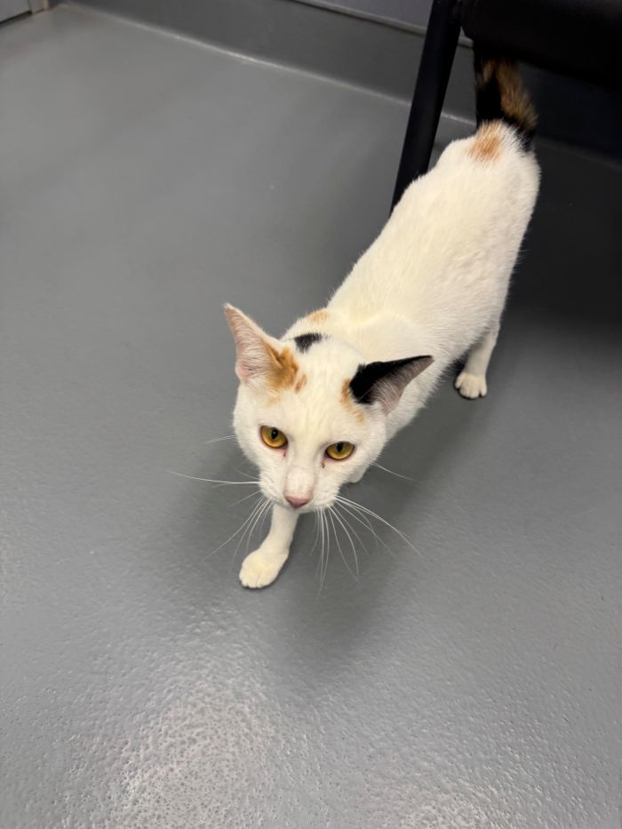 Aggie is a lovely domestic shorthair with mostly white fur accented by soft orange and black markings. At 2 years old, she’s the perfect mix of curious and sweet, always interested in what you’re doing, yet gentle in the way she seeks attention. Aggie adores curling up in laps and soaking in affection, especially from someone who matches her tender nature. She’s ready to find an owner just as kind and loving as she is.