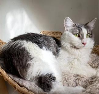 Ali — Gentle, Cuddly, and Sweet as Can Be Meet Ali, a beautiful grey-and-white fluffy princess with a heart full of love and a purr that melts stress away. She and her sister AJ were left in a cardboard box outside a vet’s office in the Central Valley, but this dainty girl has only love to give. Ali adores being close to her humans — she’ll nuzzle your hand for more pets and loves to start the day with cozy morning cuddles. Once she realizes you’re a friend, she warms up quickly and will shower you with affection, checking in throughout the day for extra snuggles and purrs. She’s lived with other cats before and is adjusting well to meeting new feline friends. Ali would do great on her own, with AJ, or in a home with another gentle cat who matches her calm, affectionate energy. With her soft, silky coat, Ali will need someone who can brush her regularly to keep her fur looking as beautiful as she is. She’ll happily reward you with purrs and cuddles in return. Available for adoption in the San Francisco Bay Area through Give Me Shelter Cat Rescue.Follow her sweet moments on Instagram: @chez_haze Please note:Indoor only For more information & an online application go to https://www.givemesheltersf.org/adoption/cat.php?id=12319&ts=1761721354&src=rg