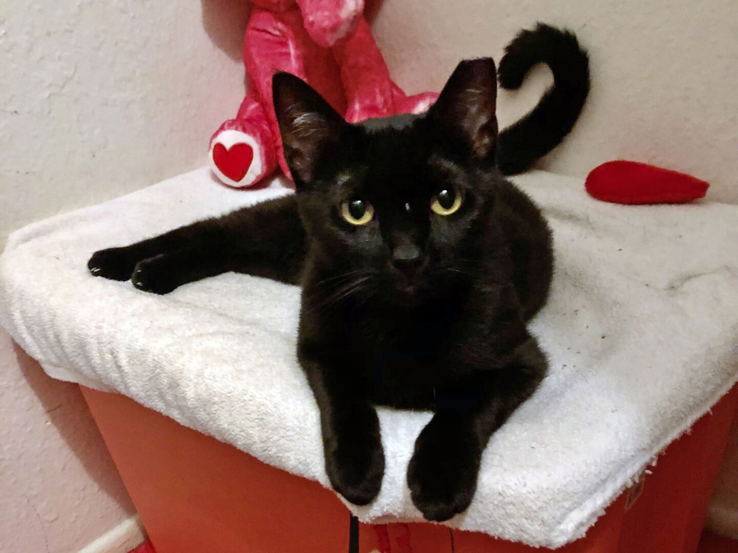 I am currently available for adoption at the Rancho Santa Margarita Petsmart. If you’re interested in adopting me, fill out an application on our website www.carmaoc.org Hi! My name is Alley and I’m a sleek, soft, and beautiful black kitty. I am a real sweetheart, very gentle and affectionate, quiet kitty. I love to play with all cat toys. My favorite is the wand with the mouse on the end. I love playing in tunnels and cat cubes. My adoption fee is $175. That includes spay/neuter, microchip, FIV/FeLV combo test, current vaccines and health check.