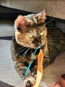 Hi! I’m Amelia! I was rescued at ACT Spay/Neuter Clinic in Stockton, CA. I’m a social, curious, playful and gentle Tortie. I guess you can say I’m a little bit of everything good! I’m very easygoing and quite polite if I don’t say so myself. I never demand anything, although I might suggest things with my tiny and sweet meow. Humans peek my curiousity and I’ll always graciously acknowledge you. I’ll even follow you around to keep you company or if you’re up for it, to get some nice belly rubs and cuddles from you. I’m also playful and love a good play session. Whether I’m chasing a wand toy or bunny kicking a catnip toy, a daily dose of a active fun always makes me happy. It also helps my overall health. As you can see, I’m a tad bit chonky and am working on getting to a better weight. My foster humans recently transitioned me to wet food and are feeding me at designated times which will also help a lot. No more free fed kibble for me! I do prefer to be your one and only fur baby. I’m so well-rounded,… purrsonality-wise, not just physically… all you’ll need is me! Are you looking for a pawsome Tortie like me to join your family? Please note:Amelia would do best as an only childIndoor only For more information & an online application go to https://www.givemesheltersf.org/adoption/cat.php?id=12140&ts=1737187351&src=rg