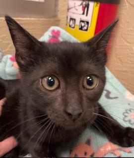 Meet Amelia! Just like her namesake Amelia Earhart, this gorgeous black beauty loves being up high—especially perched on her favorite cat tree, surveying her kingdom like the adventurer she is! Amelia is a playful, affectionate, and curious kitten who adores being around people, other cats, kittens, and even dogs. She’ll happily rub against your legs for pets and attention, and her purring motor gets going the second you say hello. Food-motivated and always up for a treat, Amelia is easy to bond with and would thrive in a loving, active home. Whether she’s climbing, playing, or snuggling, this little explorer is ready to fly straight into your heart. Ready to adopt a high-flying sweetheart? Amelia is waiting to meet you! Please note:Amelia is ok with dogs and small children For more information & an online application go to https://www.cathouseonthekings.com/adoption/cat.php?id=27199&ts=1761721409&src=rg
