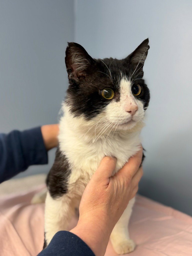 See Amos’s HomepageGo to our official websiteYou can fill out an adoption application online on our official website. Meet Amos, a handsome tuxedo cat who’s ready to leave his outdoor days behind and settle into the comfort of a loving home. After spending much of his life exploring outside, he’s now looking for a quiet place to relax and be cared for. Amos is sweet, easygoing, and enjoys gentle companionship. He has a naturally curious side and likes to observe his surroundings, but he’s just as happy curling up in a cozy spot and taking it easy. With his striking black-and-white coat and calm, kind personality, Amos will make a wonderful, loyal companion for someone ready to give him the peaceful retirement he deserves.