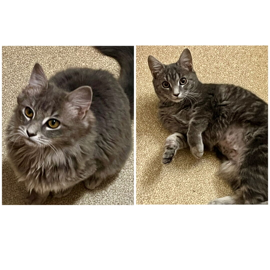 SAMMIE – She is a small, timid, FLUFFY girlie, loves to play w/toys with you, rolls on her back like she wants to be pet but takes off like bullet if approached. Fine with kids & dogs. likes her catnip & mouse toys. Fine with/me cuz she knows my voice. Purrs but no touch allowed YET. Comes right to me as all three do when AM & PM canned food. She should be adopted with her sister Andie ANDIE purrs non stop, loves to greet you when you walk in a rm but dont try & touch her, she takes off! She will play w/you endlessly & intently w/toys. Loves her catnip! If you catch her & hold her so she cant get away she tollerates body petting with pinned ears but purring. Andie should be adopted with her sister Sammie