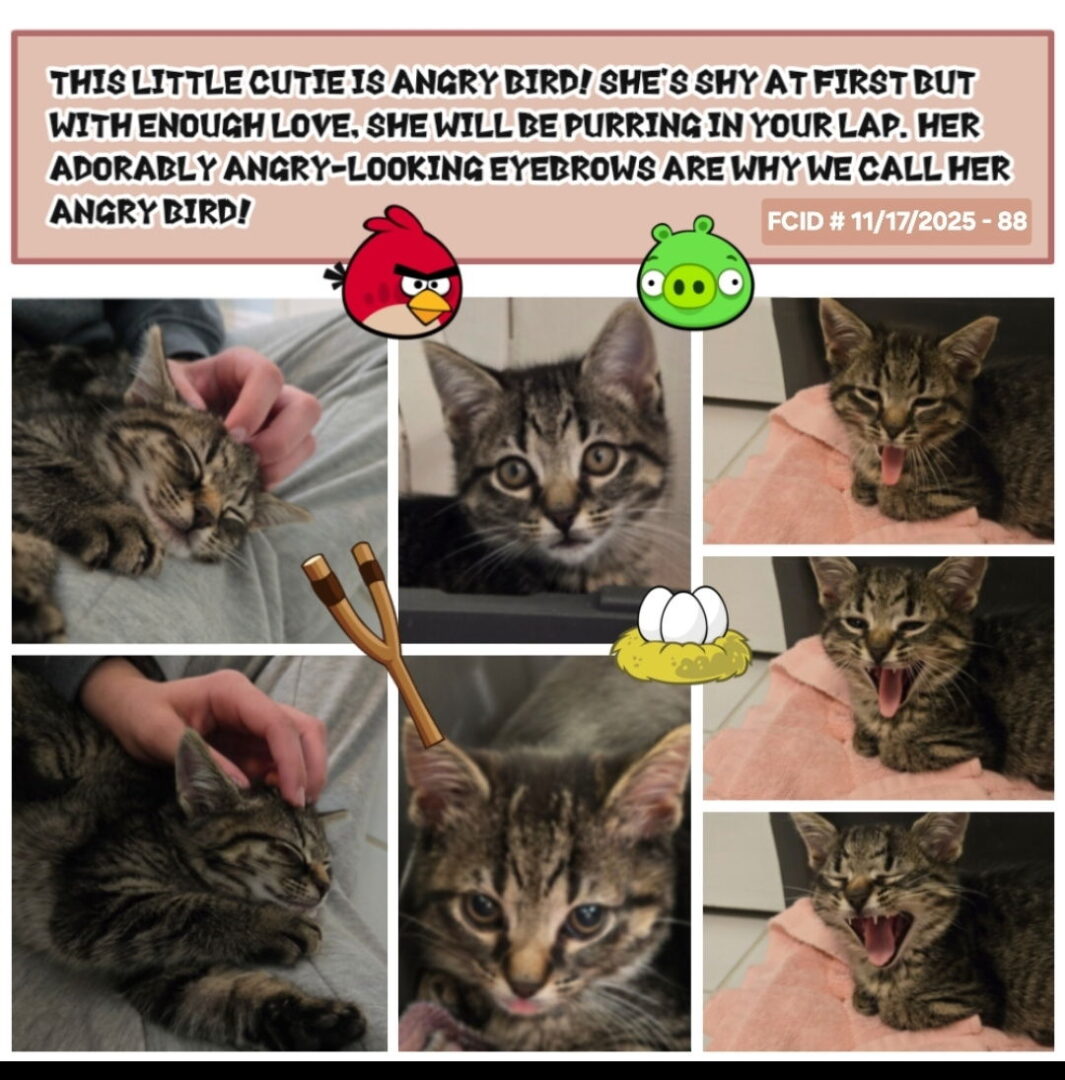 Cuddle-bug!! This baby girl is named Angry Bird, just the looks, not the purrsonality. She is playing with her sister Spider-man and with their foster family. The foster says, ‘The kittens have been around children, the youngest being 9. Angry Bird is a bit nervous with dogs, but her siblings encourage her to play. She’s cautious but loves to play, too! She’s more of a cuddle bug.’ The sisters are now playing in our Brandywine PetSmart adoption center. Please stop in for a visit! Please submit our no-obligation Adoption Application for a meet and greet or to adopt: https://forgottencats.org/adoption-application/. Thank you! (Foster: Sarah D.)