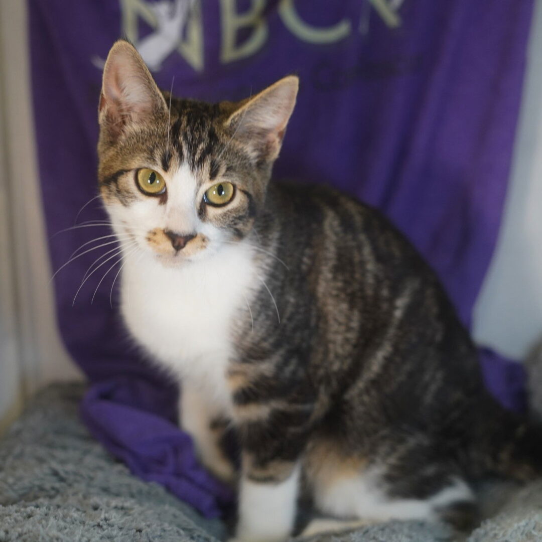 Annie is an adorable DSH gray tabby with white female born approximately 3/30/2025. My Story… When I was just a week old, I was found all by myself in a mud puddle in a parking lot. The sweet lady that found me drove 3 hours to bring me to my foster's house! When I arrived, my new foster mom introduced me to my adopted mom and sister who welcomed me right away. Over the next week, my foster mom decided that I needed more sisters and she brought in 2 more babies that didn't have a momma. We were now a complete, happy family of 5! I have been a spunky, sassy, sweet, and playful little girl from the beginning. I love playing with my mom, siblings, and foster parents. My favorite time, besides eating and playing, is snuggle time with my human mom. I LOVE to climb and explore places high up, even when my foster momma tells me not to. I love watching TV, too! I get along well with my siblings and my foster has started socializing us with her 5 cats! I am now ready to find a fur-ever home of my own and will make a wonderful addition to any family! Annie is microchipped and currently in a foster home. Her adoption fee is $105.