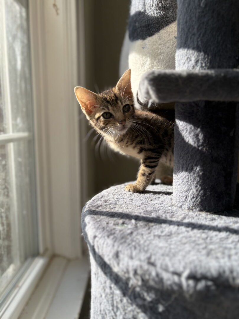 Hi, I’m Anzu — professional snuggler, amateur acrobat, and full-time snack enthusiast. Yes, I know what you're thinking: “Where’s the rest of your tail?” Great question. The truth is, I sacrificed it in an epic battle with a sock monster (or I was just born this way — we’ll never know, because I’m mysterious like that). Either way, I may be short on tail, but I’m overflowing with personality. I play hard. I snuggle harder. And when it’s mealtime? Let’s just say I bring the drama — Oscar-worthy performances to make sure I’m not forgotten when the food hits the bowl. Looking for a tiny roommate who doubles as a fuzzy neck warmer, toy assassin, and stand-up comedian? Then congrats — you just found your new best friend. Anzu =^..^, DSH Manx/Brown Tabby, Female, DOB 4/7/2025 https://cataroundtownproject.org/adoption-application/