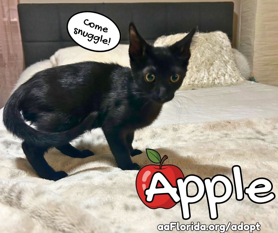 See Apple’s HomepageGo to our official websitePlease consider sponsoring a cat. For a little as $10 a month you can help us help more animals in need.My name is Apple and I'm looking for my fur-ever home! My cat mama needed some help taking care of my two siblings and I, so a nice human has been our second mama. I'm really outgoing and social – I especially love my tummy rubs and playing with toys! Our adoption fees are $75.00 for any kitty 6 months of age or older. $85 for kittens under 6 months of age. Included in each adoption: age appropriate shots, microchip, and spay/neuter surgery. All kitties are litterbox trained. Prior to meeting or adopting any of our wonderful kitties, we ask that you please fill out our online Cat Adoption Application on our website aaFlorida.org/adopt. There is a link on the top of the home page. Click on "Fill in", you don't have to register. For more information about this kitty or any others, you can contact us at Adoptions@aaFlorida.org. We are a foster organization and don't have set hours we are open – but we will gladly set up an appointment for you to meet any cat. Of course, you're under no obligation to adopt if you come to meet any of our fabulous felines.