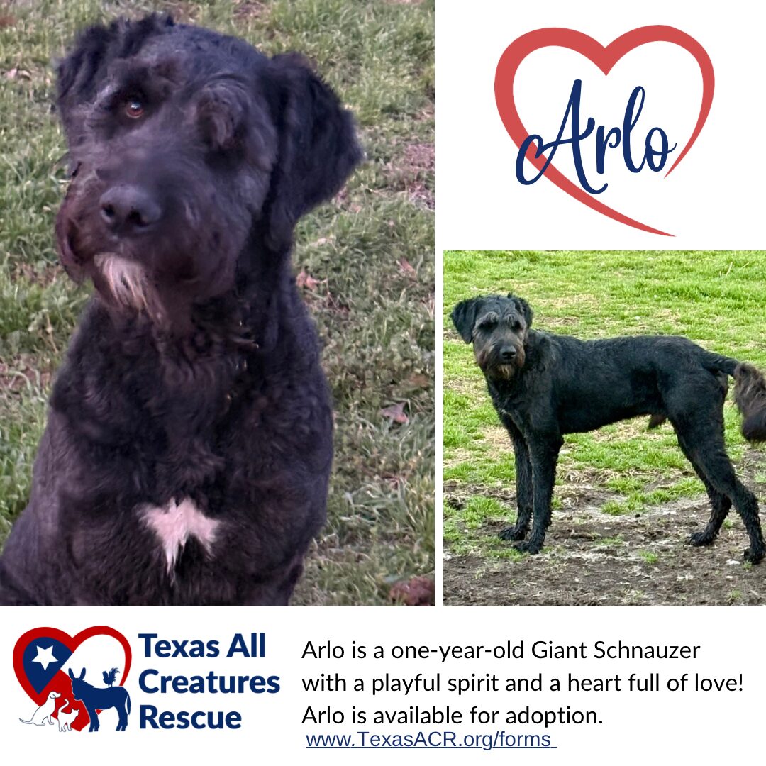 See Arlo’s HomepageGo to our official website Meet Arlo~Your Loyal Adventure Buddy! Arlo is a playful, one-year-old Giant Schnauzer with a heart as big as his personality! This athletic boy loves to chase squirrels (and can clear a 4-ft fence with style while doing it), so he’ll need a spacious yard with a secure 5 to 6-foot fence to safely romp and play. This sweet boy was found running the streets, horribly matted and in desperate need of care. He was immediately taken to a groomer and had to be shaved down, but underneath all that fur was a handsome, loving pup ready to start his new chapter. Arlo is now completely vetted, neutered, microchipped, and on heartworm preventative. Arlo has excellent recall and just needs a watchful eye when he’s outside. He’d love a medium to large canine playmate to burn off energy with, and while he adores children, his size means he’ll need supervision around the little ones. Underneath his playful exterior is a tender-hearted cuddle bug who wants nothing more than to please you, and if you let him, he’ll happily crawl into your lap for snuggles. If you’re looking for a loyal, loving companion who’s always up for fun (and maybe a squirrel chase or two), Arlo is your guy! We are a non-profit 501c3 Animal Rescue located in Dallas/Fort Worth, Texas. Our passion is centered around assisting animals that have been abandoned, neglected, or abused. We are a foster-based rescue consisting of 100% volunteers. If you are interested in becoming a foster, please email info@TexasACR.org