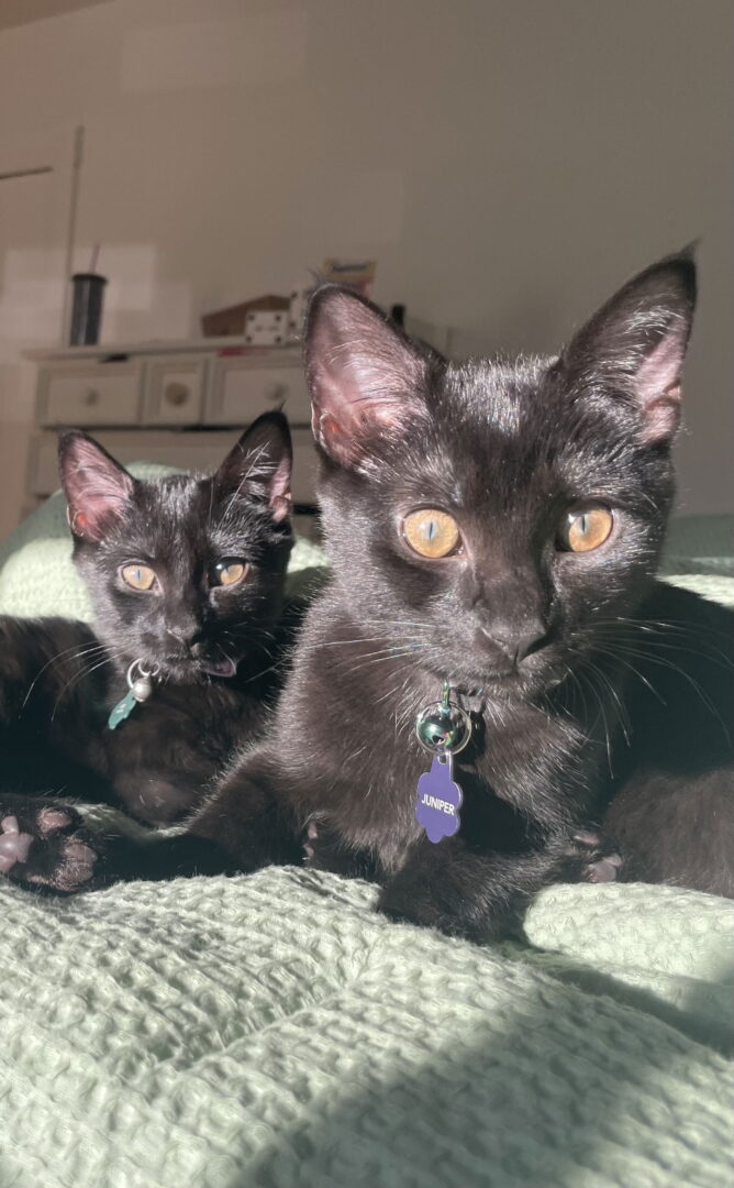 See Arson and Felony’s HomepageGo to our official websiteYou can fill out an adoption application online on our official website. Meet Arson & Felony Arson and Felony are a bonded pair of sleek black domestic shorthair cats, both about 2 years old, and they are truly a package deal. These two have grown up together and are happiest when they’re side by side, whether that’s curled up for a nap or trotting over together to ask for attention. They are incredibly sweet, affectionate, and loving cats who absolutely adore cuddling. They love being close to their people and will happily settle in for snuggles on the couch or in bed. Both girls have wonderful, gentle temperaments and get along great with other animals, making them an easy addition to a home with existing pets. Arson and Felony are being rehomed through no fault of their own due to housing issues, and they deserve a safe, stable home where they can stay together forever. They have so much love to give and will bring warmth, comfort, and constant companionship to whoever is lucky enough to adopt them. If you’re looking for a pair of affectionate, easygoing best friends who will fill your home with love and cuddles, Arson and Felony are waiting for you.