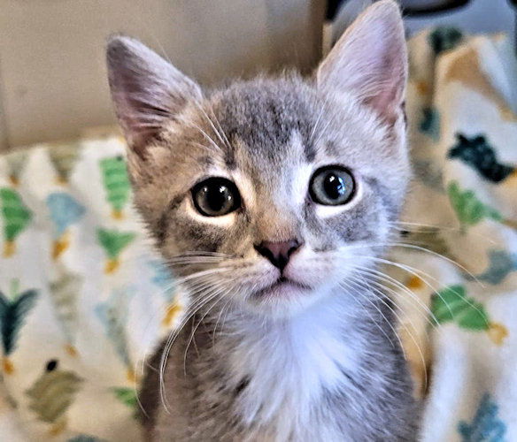 Artemis is a gray and white kitten with touches of tan here and there, born om March 25th 2025. He is a handsome bottle raised baby He wears his white socks everywhere he goes. He is super loving and playful, with just a touch of sass. Artemis is litter trained and loves toys, and his kibbles mixed with some canned kitten food. He is looking for his forever family. He is great with other cats and dogs. Indoor cat only! He has sisters named Lorna, Pixie, and Sasha. The adoption fee is $150. This covers the cost of spay/neuter, PVR, Rabies, flea, tick, ear mite and worm treatment. To adopt, you need to first fill out an application. Go to: https://rutherfordcountyhumanesociety.org/cat-adoption-application/ We are located in Western North Carolina. Optional transport is weekly. After your application is approved, we will contact you regarding cost and delivery if you so desire.