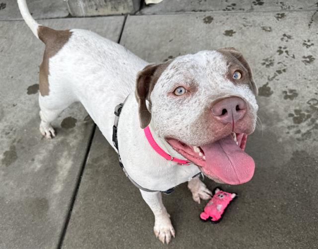 Artemis’s energy is contagious — she’s always ready for playtime, zoomies, and fun adventures, but she’s just as happy snuggling close once the excitement winds down. This playful young lady lives for being around her people, soaking up every bit of love, pets, and attention you can give her. With her affectionate heart, goofy personality, and endless enthusiasm for life, Artemis is the kind of dog who turns every moment into pure happiness. She’s ready to bring laughter, love, and boundless pittie charm to her forever home.
