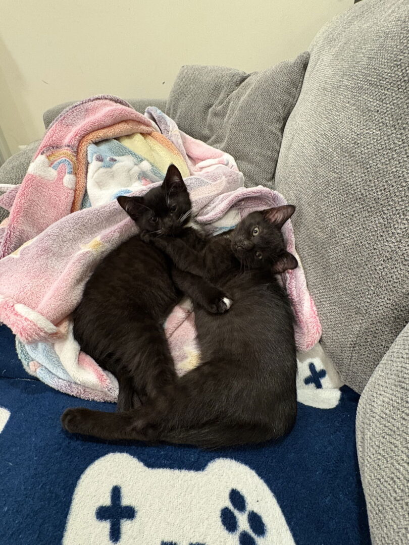 Meet Orion & Astrid, a celestial duo Orion and Astrid are a beautiful bonded, brother-sister pair of black kittens who were rescued from Baltimore at around 4-5weeks old. Now at about 12 weeks(estimated), these two are bursting with personality and love, and are the perfect mix of high-energy playfulness and heart-melting affection. With their white chest markings, they look like 2 miniature crescent moon bears. Orion (boy) has the more flashy fashion, with a big, irresistible white heart closer to his tummy, white go-go hind booties, and little strips of white toes in his front paws. Astrid(girl) prefers the more demure, minimalist look, complete with adorable black toe beans and darling black whiskers to match. They are fantastic around little kids and everyday chaos. Both kittens are very social and affectionate.Their extra-loud, rumbling purrs start up the moment they’re picked up. They love to zoom, wrestle, and explore together, then come naptime, they will come snuggle on top of you, creating a cuddle pile vibrating with contentment. Orion is curious and confident, always ready to investigate something new, while Astrid is equally energetic with a sweet, snuggly side that shines through quickly. Together, they keep each other entertained, confident, and happy. If you’re looking for double the fun, double the affection, nonstop purrs, and kittens who fit right into a busy family life, Orion and Astrid are ready to steal your heart. Astrid: Female 2025-0353 Orion: Male 2025-0353 Please note it is Fancy Cats' policy that kittens have an age-appropriate playmate in the home. We also do not adopt kittens to families with children under six years old without seeing appropriate history/experience with cats. Adoption fee: $350/pair, includes 1 st FVRCP, deworming, deflea, microchip If you are interested in adopting, please fill out an application and a representative will get back to you shortly to answer any questions you may have. The adoption policies and applications can be found at the following links: https://fancycats.org/adopt-a-cat and https://fancycats.org/adopt-a-dog. Email us at adoption@fancycats.org for general questions about our rescued cats. Email us at dogadoptions@fancycats.org for general questions about our rescued dogs. See our calendar of adoption events at https://fancycats.org/(scroll towards bottom) You can save animals like this one by becoming a foster! Fosters are like bridges between high kill shelters and forever homes. We need fosters so that we can save cats and dogs before they are euthanized at the shelters. If you are interested in becoming a foster, please visit: https://fancycats.org/volunteer