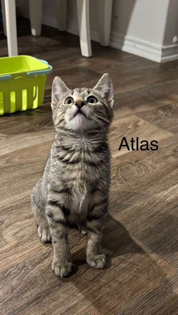 Meet Atlas, a curious little explorer with a heart as big as his name! Atlas is thriving and he is already a pro at using the litter box and happily enjoys his wet food. Playtime is his favorite, especially when he is wrestling or chasing toys with his brother, Kyro. Atlas is wonderfully gentle and unfazed by his foster homes bustling activity, including a sweet pug and lively toddler twins. After a good romp, he is more than happy to curl up for a cozy cuddle. Atlas would love a forever home where he can keep adventuring and maybe even stay with his brother, if possible!To inquire about adopting this cat please complete an adoption application at tinyurl.com/ccapadoptions Once you submit an adoption application, a foster will reach out within 48 hours to schedule a meet-and-greet or ask any additional questions. If you haven’t heard back within that time, please contact **adoptions@sanantonioferalcats.org** so we can follow up. If the cat you’re interested in isn’t listed in the dropdown menu, it may be pending adoption or recently adopted, but the website hasn’t been updated yet. Feel free to email us for confirmation. Thank you for choosing to adopt one of our amazing cats!