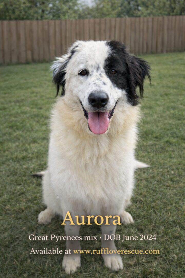 Aurora is a wonderful Great Pyrenees mix. Estimated birth date is June of 2024. She weighs 53 pounds. She's playful and thrives with human contact. Aurora needs boundaries as she is both toy and food aggressive. She has been in foster homes with other dogs but needs firm rules. She would make a fantastic family pet especially if she is your one and only. ~~ Adoption donation $400 . All vetting is up to date. Microchipped and spayed. Also on flea/tick and heartworm preventative. Visit www.ruffloverescue.com/adoption and fill out the application to make this pup a member of your family