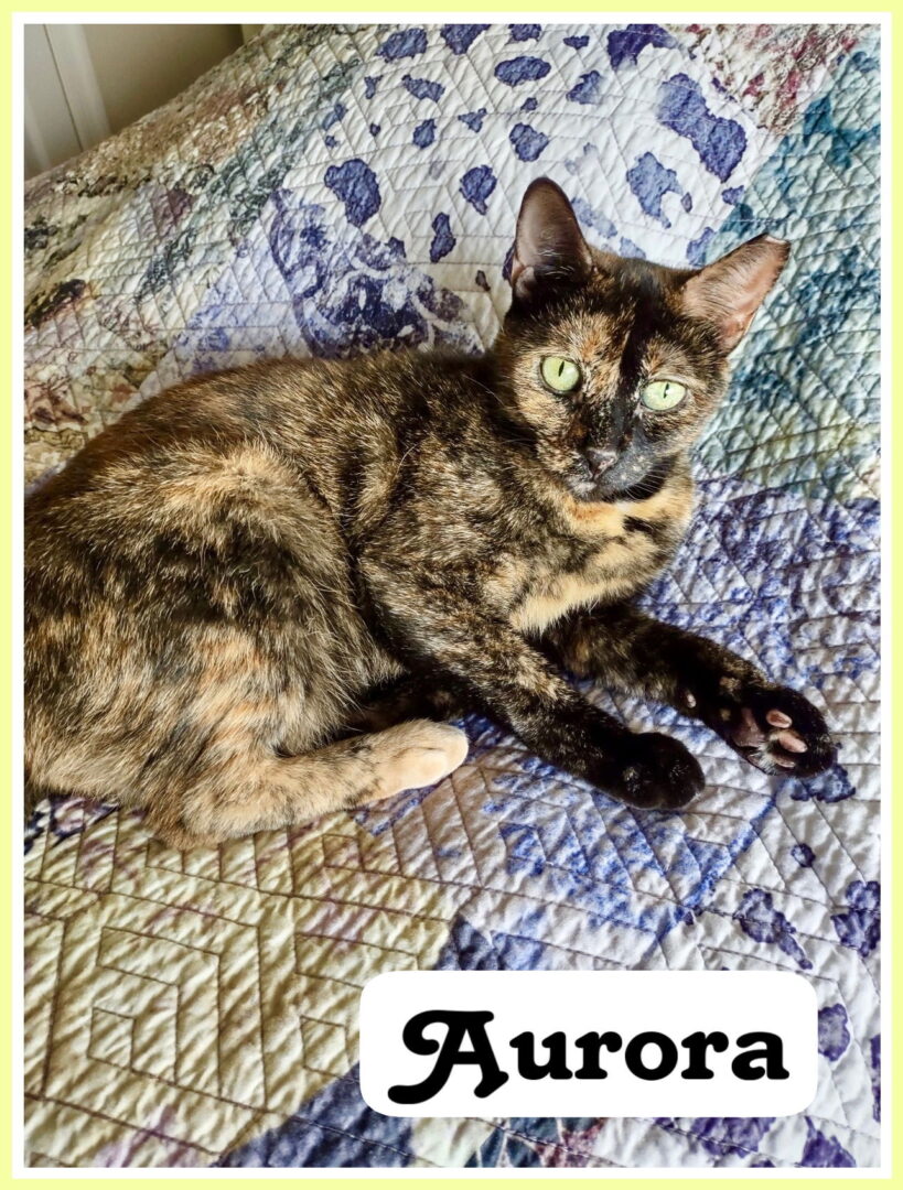 Meet Aurora, a beautiful adult tortoiseshell with a two-toned face. This young lady had a tough time on the streets, but at Forgotten Cats, she enjoys the security of constant food, soft blankets, and attention from caretakers. Her unique markings make it hard to resist showering her with affection, but in typical tortie fashion, Aurora will let you know if she is in the mood for attention or when she’s had enough. She loves playing with a wand, sometimes while hiding in her favorite paper shopping bag, trying to catch the wand as it goes by. This frisky little girl also likes to play hide and pounce with her balls and springs. She also enjoys watching TV and looking out the window. She will claim your bed for her own but generously allow you to sleep there, too. When you wake up, she just might give you a head butt or lick your hand, probably to encourage you to get her breakfast. She is comfortable around adults and we think she would be the perfect fit for a calm adult household with no other cats as she seems to be overwhelmed by feline companions. While we don’t know how she would respond to dogs or children, she is best in an adult household. Please check out her video: https://www.youtube.com/shorts/SNXSTaeVTG0 . Aurora is playing with her foster family. Please submit our no-obligation application for a meet and greet or to adopt. https://forgottencats.org/adoption-application/. Thank you! (Foster: Cheryl P).