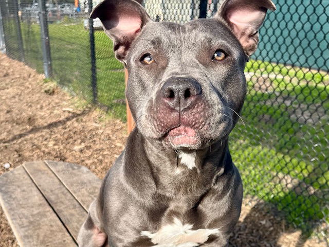 Meet Ava! This gray pittapotamus came to the Shelter as an owner surrender after her previous guardian was unable to continue caring for her. Ava was described as friendly with strangers by her previous guardians. She has not lived with children previously but has meet children and did well. She is house trained and was crated when left alone. Ava’s favorite things are running, sniffing, and cuddling. Prior to coming to the Shelter, Ava had a dog friend who was a male pitbull of a similar size. She would play with him and enjoyed his company. In her previous home as well as the Shelter, we have observed some reactivity when on leash/behind barriers. Adopters should set Ava up for success to avoid her practicing the behaviors related to reactivity by walking her in low traffic areas and working on disengagement from other dogs/focus on her guardian through force free training. Ava met two similarly sized dogs (Hudson, male pittie, and Sprinkles, female Catahoula). She comes on strong on strong, plays rough but was appropriate in her play. A home with a dog that enjoys that style of play and is fairly dog savvy may be a fit. Any resident dogs in the home are required to meet prior to adoption. Due to Ava’s play style that may not be every dog’s cup of tea, adopters are highly recommended to avoid dog parks and instead set up one on one playdates with known, dog social dogs. We do not have any history of Ava living with cats. Please note: Our Santa Cruz location’s Shelter hours are 11-6pm, 7 days a week! Although clients can walk through and see any animals in their kennels during open hours, we end “meet and greets” (aka meeting an animal out of the kennel) at 4:30pm every day. If you’d like to meet an animal out of the kennel, please arrive before 4:00pm to allow for time to discuss individual animals and meet them.