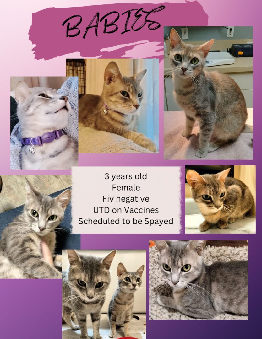 See Babies’s HomepageGo to our official websiteYou can fill out an adoption application online on our official website.PURRS ABOUND SIAMESE RESCUE OF MICHIGAN,INC.9/25/2023 Baby is still hoping for a forever family or person and hopes they will adopt her bonded friend Mickey. 06/18/2023 Baby is a very affectionate young adult fostered in Rochester Hill, MI who will be ready soon to interview her new forever family.Ideally, her new family will also adopt her best friend, Mickey (being posted separately) or have a current resident cat for companionship. Baby loves attention and is constantly rubbing up against her foster mom’s leg asking for scratches and cuddles and even face rubs. Of the 3 kitties that came with her to Purrs Abound from her previous home, Baby is the most open about wanting affection. Baby has loved with a mild mannered senior dog but we don’t know if she has been around children. If you would like more information about adding Baby ( and perhaps Mickey) please PM Purrs Abound Siamese Rescue of Michigan, Inc.