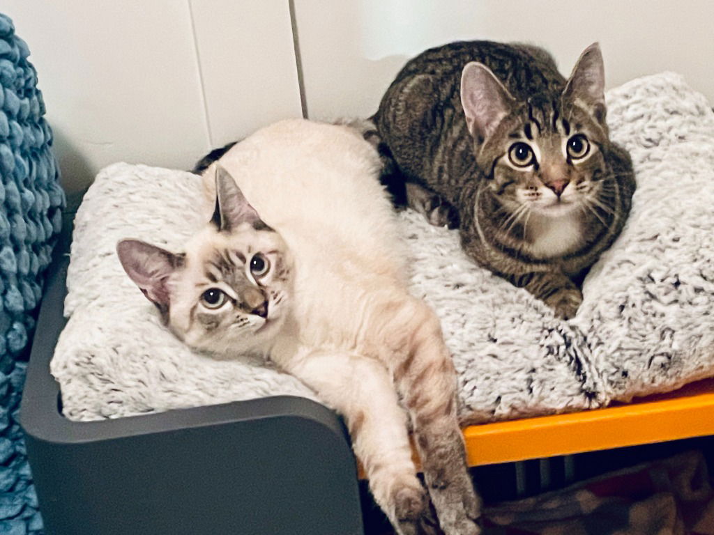 Meet Posh Spice and her brother Baby Spice! These two littermates have a tight-knit bond and must be adopted together. Their foster pawrent has been socializing them with various people but they thrive best in a peaceful and serene home without children. Posh Spice and Baby Spice enjoy cuddling together on the cat condo by the window, observing birds, and basking in the sunlight. They have a fondness for churu cat treats, feather wands, and cardboard boxes sprinkled with catnip. Both Posh Spice and Baby Spice have introverted personalities and require time to acclimate. Currently, they are not inclined to sit on laps, but they appreciate lying beside humans on a blanket on the floor while being petted and purring loudly. Once trust is established, their bond with you is unbreakable. If you are interested in adopting a CAWS pet, please fill out an online application at https://caws.org/adoption-application