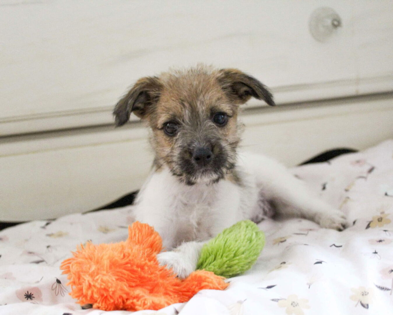 See Bagel’s HomepageGo to our official websiteYou can fill out an adoption application online on our official website.This is a list of the current animals available for adoption from Krewe de Rescue. If you would like to meet an animal we have available for adoption, please fill out the adoption application. All fields must be filled out for application to submit properly. If a field does not apply to you, please enter N/A in the field. Adoption Application adoption application >>> Bagel is a 2-3 month old wire haired Jack Russell Terrier. She was found dumped on the wood line of a speedy road, so we are unsure what she is mixed with. She is a tiny 5 pound, bouncy and quick girl. She is very smart and absolutely adorable! She currently lives on a little farm and she loves to run with the big dogs in the home. It is amazing how quick she can move those little legs! She also slips through the fence daily to visit with the goats and equines on the property Her foster mom has done a whole lot of worrying about her! She is fearless and doesn’t see herself as a tiny 5 pound puppy. Whoever gets her will have to accept that the only thing small about her is her size. Bagel-bite is crate trained and is working towards being house broken. She is a special dog. She hasn’t met a person yet that didn’t just love her immediately. Our adoption fee is $175 and includes age appropriate vaccines (at least two rounds for puppies), vet check, spay and a microchip. If you are interested, please complete the application listed below. https://toolkit.rescuegroups.org/of/f?c=DMBCNVST