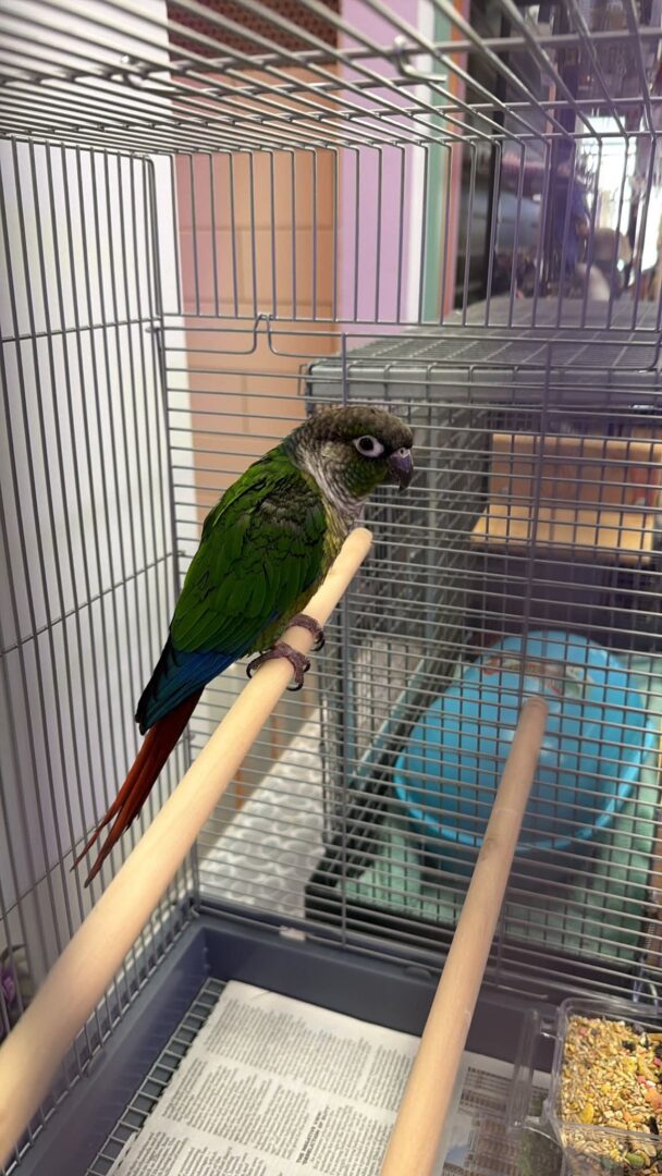 See Basil’s HomepageGo to our official websiteYou can fill out an adoption application online on our official website.Basil is a male (DNA tested) green cheek conure. His hatch date is 5/29/2022. Conures can live up to 35 years so this guy is just a baby and has tons of life left to live. Basil was hand fed as a baby and was very attached to his previous owner, but he unfortunately passed away and Basil has been having trouble trusting anyone else right now. He doesn't seem to mind the kids or other animals in his foster home and loves to have conversations. His previous owner stated that he has some words but it might take some time for him to heal from his loss and start talking again. He could use someone who will give him time to adjust to his loss and hopefully find a new buddy. His adoption fee is $300 To adopt Basil, fill out an application at www.kakf.org/forms
