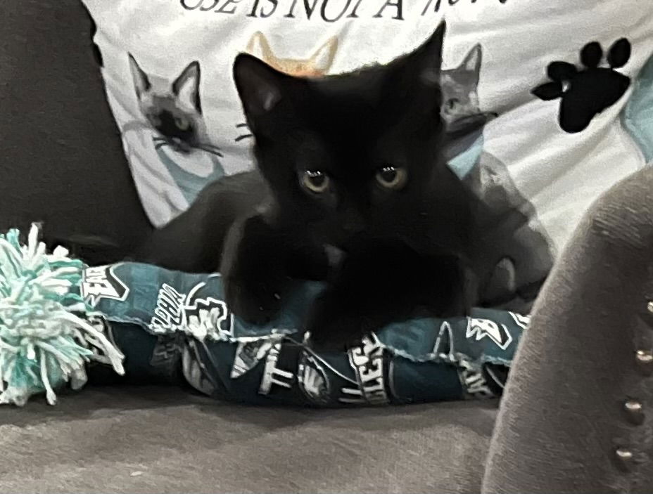 Bear is Smokey’s bonded and twin brother. The two are nearly identical with their white neck patches however Bear only has one white patch. Bear lives up to his name as a snuggly, fluffy fur friend who loves affection and quiet time. When he’s not playing and hanging with his brother Smokey, he’s hanging with his best friend Missy. Bear is playing with his foster family. Submit a no-obligation application to adopt today: https://forgottencats.org/adoption-application/ (Foster: Janeen C.).
