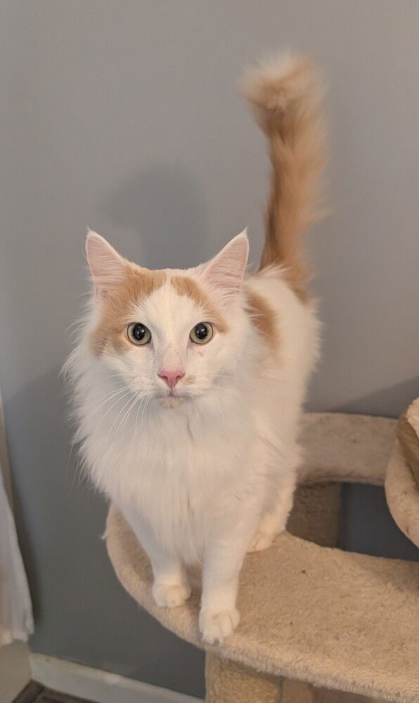 Meet Benson (Boone)– Your Purr-fect Headliner! Say hello to Benson Boone, a 5-year-old long-haired heartthrob with a snowy white coat splashed in warm orange and the most breathtaking turquoise blue-green eyes you’ve ever seen. Named after the singer for his big, bold, fun-loving personality, this boy is a true showstopper — equal parts rockstar and cuddle bug.Benson’s story started on a sad note. He was rescued from euthanasia after showing stress behaviors caused by being bullied by another cat. Now that he’s in a calm, loving foster home, those behaviors have virtually disappeared, and his true melody is shining through — confident, curious, and full of life. Personality Highlights:Certified orange cat energy with hilarious anticsCurious, playful, and always ready for an encoreA total purring machineSuper cuddly and loves being wherever you are — desk, lap, closet, you name itFollows you around like your loyal backup singerComes when called (yes, like a dog!)Loves toys, cat trees, boxes, and even climbed a giant ladder to supervise Christmas decoratingGets along wonderfully with other cats and even the two large dogs in the homeAt around 10 pounds of pure charm, Benson Boone is the definition of cool. He’s the kind of cat who steals the spotlight, then steals your heart — and probably your chair too.If you’re ready for a loving companion who will turn your life into a cozy, musical love song, Benson Boone is ready to go on tour straight into your home. Adopt Benson Boone and let the good vibes play on!
