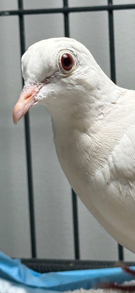 Sweet Bette has the biggest eyes I’ve ever seen on a dove. Full of curiousity! I’ll know more of her (I think hen) personality as time progresses. She’s lucky to be alive as she used to be housed with chickens.Please apply to adopt http://www.pigeonrescue.org/birds/apply-to-foster-or-adopt/