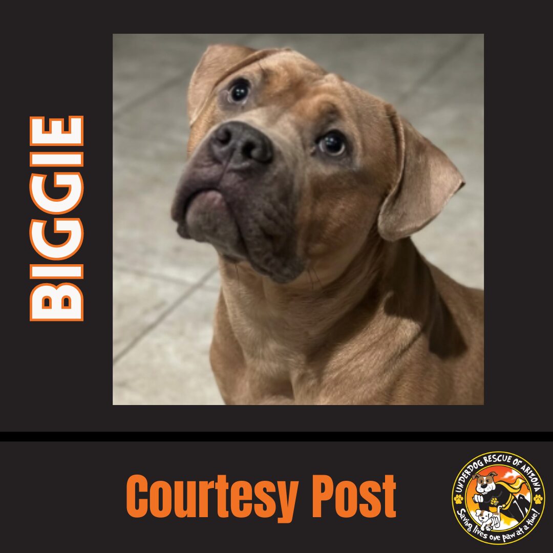 Name: Biggie Sex: Male Age: 3 years old Breed: Pittie mix Weight: 60-70lbs Compatibility with other dogs: Best as an only dog Compatibility with cats: Not good with cats Compatibility with kids: Not tested Spayed/Neutered: Yes House trained: Yes Doggy door trained: Yes Crate trained: Yes Activity level: High Obedience training: Not known Personality/Behavior: Leash trained, Crate trained, Does well in a car, Likes to fetch, Likes toys, Lap pet, Protective/territorial, Playful, Affectionate, Gentle, Goofy Requirements: Meets the whole family; Active home for high energy dog; No dogs or cats in the home PLEASE NOTE: This dog is courtesy posted for another individual or Rescue. Different policies and fees may apply. MEET BIGGIE #3!! Biggie is a sweet and energetic boy. He LOVES to run around the yard and always gets the zoomies. He also loves treats, toys and to hangout on his dog bed and chill. He has always been a loving boy with people, but he doesn't like all dogs. He gets along with some, but not all. He can be reactive. He would do amazing in a home with no other dogs or cats. Then he would get all the love and attention he deserves. Biggie is house trained, crate trained and doggy door trained. He walks on a leash and does well in the car. He likes to play, and he likes to hang out as well. He has lots of energy, so he would love an active family. Biggie deserves the best home. Meet Biggie today! If you are interested in meeting this dog, please visit our website for our online application www.underdogaz.com PLEASE NOTE: This dog is courtesy posted for another individual or Rescue. Different policies and fees may apply.
