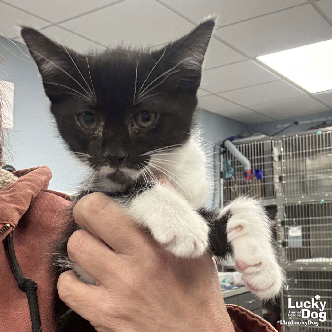 Sweet baby needs a forever home!BINGS NEEDS A FOREVER HOME! Name: Bings Best Guess for Breed: Domestic Short Hair Age: 9 weeks as of 12/20/25 Est. DOB: 10/16/25 SEX: Male Weight: 2 lbs as of 12/20/25 Coloring: Tuxedo Type of Hair: Short Gets Along With: Because of his young age, Bings will likely get along with other cats, dogs and kids with an acclimation period. We’re happy to help with tips and tricks! Currently Living at: Shelter – coming to the DC area soon! I am Looking For: My loving forever family! Hi! I’m Bings, and I am a cute little kitten! I won’t ask for much- just some love, cuddles and lots of toys so I can run and play and be my kitten self. Two kittens are better than one – consider adopting one of my super cute siblings too! Litter: Barnaby, Bings, Bird What my Foster Says About Me: Coming soon! Kitten Vetting Requirements: Your kitten may not be fully vaccinated upon adoption. You will be responsible for providing whatever remaining vaccines are needed to complete the kitten vaccine series. Due to this kitten’s young age, she/he has not yet been spayed or neutered. As part of the adoption contract, it will be your responsibility, as the adopter, to ensure that this is done no later than 4/16/26. There are NO EXCEPTIONS and NO EXTENSIONS to this date. A non-refundable spay/neuter deposit will be collected if you would like Lucky Dog to pay for this animal to be spayed/neutered at one of our low-cost partner vets. TO ADOPT: The adoption fee for adult cats is $200 ($350 for two cats adopted together). The adoption fee for a kitten (under 7 months old) is $220 ($380 for two kittens adopted together).If you are interested in adopting, please complete the Adoption Questionnaire online at bit.ly/adoptaluckycat. Lucky Dog Animal Rescue does our best to provide accurate information about the cats we have for adoption. That said, we cannot make any guarantees about age, breed or temperament. Thank you for contacting Lucky Dog Animal Rescue and helping to save a life! Please visit us online at www.luckydoganimalrescue.org . BE A FOSTER!!! Fosters make it possible for Lucky Dog Animal Rescue to save and care for homeless and abandoned dogs! To learn about fostering, please contact fostering@luckydoganimalrescue.org BE A SPONSOR!!!! Sponsors help Lucky Dog support the many dogs we save. To learn more about sponsorship, please contact info@luckydoganimalrescue.org !
