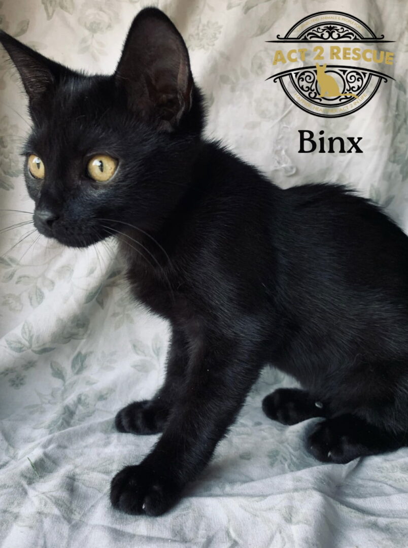 See Binx 2’s HomepageGo to our official websiteYou can fill out an adoption application online on our official website. Welcome to Act 2 Rescue where you become part of our A2R family! Adoption is an important time in your life and we are grateful to be a part of it. We take pride in offering you a personalized adoption experience with continuing behavioral support as needed. -Mindy Gould, CEO Hi, I’m Binx! I’m a handsome black kitten with a big heart and an even bigger purr! I love being held! Cuddles are my favorite, and I’ll start purring the moment you pick me up. When I’m not snuggled in someone’s arms, you’ll find me playing with my siblings or chasing my favorite toys. I’m curious, sweet, and full of kitten energy, but I always make time for a good nap and some love. If you’re looking for a playful little shadow who will keep you company and shower you with affection, I think we’d make the purrfect pair. I can’t wait to meet you! I am all ready for my new home or will be soon! Once sterilized, I will have been seen by a veterinarian, had all shots I was able to get when I was sterilized or they checked my sterilization status and microchipped! All I need now is you! I am currently living in a foster home and am fully litter trained. Act 2 Rescue will even help you make sure I am able to integrate into your human and pet family with their behavioral coaching support during the transition period. I can't wait to meet you so please fill out an application for me today! _______________________________________________________________________ Please be aware we are a small foster based rescue in Riverside, California. Our volunteers often have other jobs/careers as well. We are not a government funded shelter and all of our donations including adoption donations are used to run the rescue and help the animals in our care. Since we are no kill, higher fees for in demand breeds help us cover critical care. We are always in need of volunteers, donations, and fosters. Please excuse any wait times as we are often inundated with emergencies or short staffed due to the overpopulation crisis. You can learn more about us on our website or follow us here. Steps 1-2 of the ADOPTION PROCESS must be done before we do OFFICIAL MEET & GREETS or take deposits. To keep animals healthy, we limit foster based meet & greets to people fully qualified to adopt them. No animals can be held without a $75 deposit. Deposits cannot be refunded if you change your mind, they are to hold a cat and can result in other adopters being told they cannot adopt. ADOPTION PROCESS: 1. Application: Log into our website and complete the adoption application at link below: Applications : Forms (rescuegroups.org) 2. Virtual Home Check: Once your application is approved, check back if you haven't been scheduled for a virtual home check within 48 hours. A virtual home check to ensure safety of your residence for your kitty (not perfect cleanliness). You will be told during the visit if you pass. 3. Official meet & greet with your kitty at an adoption event, foster care, or adoption center depending on location of the kitty. We only have a few volunteers, so we apologize at times we fall behind due to high demand of some cats. 5. Sign adoption contract and, if appropriate, foster to adopt clause. 6. Pay adoption fee via zelle using act2rescue@gmail.com (not our phone number) or using cash. We can accept cards at adoption events but the terminal charges fees that are pretty high so it's not the best option. 7. Take your kitty home. Be sure to isolate kitty while they adjust to your home. We may check in from time to time to be sure you do not need any additional support because we love hearing how our kitties are doing. As volunteer staff, happy stories are literally our paycheck. 8. Check out our website https://act2rescue.org for resources, blogs and info on how to best take care of your new kitty. Our professional behavior coach is available via text to assist you with transition as well. We also have a Facebook group to interact with our behavior coach and other kitten care experts, as well as our A2R family like you! ****Please note, we do not have dedicated staff for phone lines so please text instead of calling. If the cat/kitten is listed, they are available. However, they could have pending applications or meet and greets scheduled. Filling out an application and approval does not obligate you to adopt the kitty. If they are not a fit…we have plenty of other kitties for adoption. This kitty has received at least two FVCRP vaccines, rabies if over 4 months, Revolution for fleas/ticks/heartworms/stomach parasites/ear mites, de-wormer, sterilization*, and microchip (you must register for it to work but it's free). All kitties are given a general wellness check by a veterinarian prior to sterilization. Deposits: The only way we can hold a kitty is with a non-refundable (if you decide not to adopt within 2 weeks not if we void the adoption) deposit of $75. We reserve the right to void the adoption up until the point the contract is signed. If we cancel the adoption (for kitty health or other issues) we will refund your deposit. If you wait longer than 2 weeks, we cannot hold the kitty due to space constraints. Your deposit could be used on another kitty. If you decide not to adopt at all, any deposit will go to the care of animals rescued with us and may be written off as a donation. Foster to Adopt: Kittens must be 2 lbs or 8 weeks and fixed to be adopted. This will be noted in the approximate available date. If a kitty is unable to be fixed in a timely manner, they may foster to adopt. This would be all adoption paperwork and donations would be exchanged and the kitten would go home. Adoption paperwork will have a clause that it is not final until animal is sterilized. Once the sterilization appointment arrives you must bring them in to be sterilized or the animal will have to be returned to the rescue.