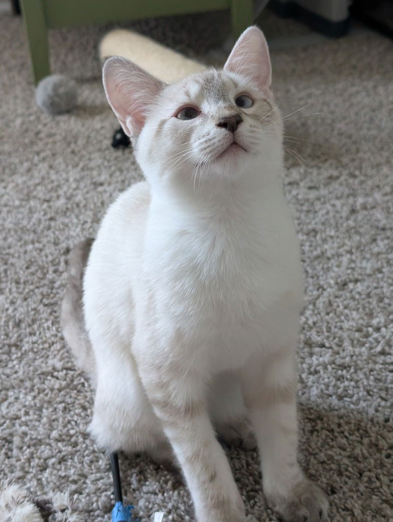 Meet Birch, the little snowflake of the group! With his bright eyes and soft white fur, he’s as gentle as he is playful. Birch loves to chase feather toys, pounce on shadows, and then come up to you for pets. He’s yet to display a love of snuggling and being held, but he’ll definitely come over to an outstretched hand and get some loving! Sweet-natured and curious, he’ll be the perfect companion for someone who wants both energy and affection in one fluffy package.To inquire about adopting this cat please complete an adoption application at tinyurl.com/ccapadoptions Once you submit an adoption application, a foster will reach out within 48 hours to schedule a meet-and-greet or ask any additional questions. If you haven’t heard back within that time, please contact **adoptions@sanantonioferalcats.org** so we can follow up. If the cat you’re interested in isn’t listed in the dropdown menu, it may be pending adoption or recently adopted, but the website hasn’t been updated yet. Feel free to email us for confirmation. Thank you for choosing to adopt one of our amazing cats!