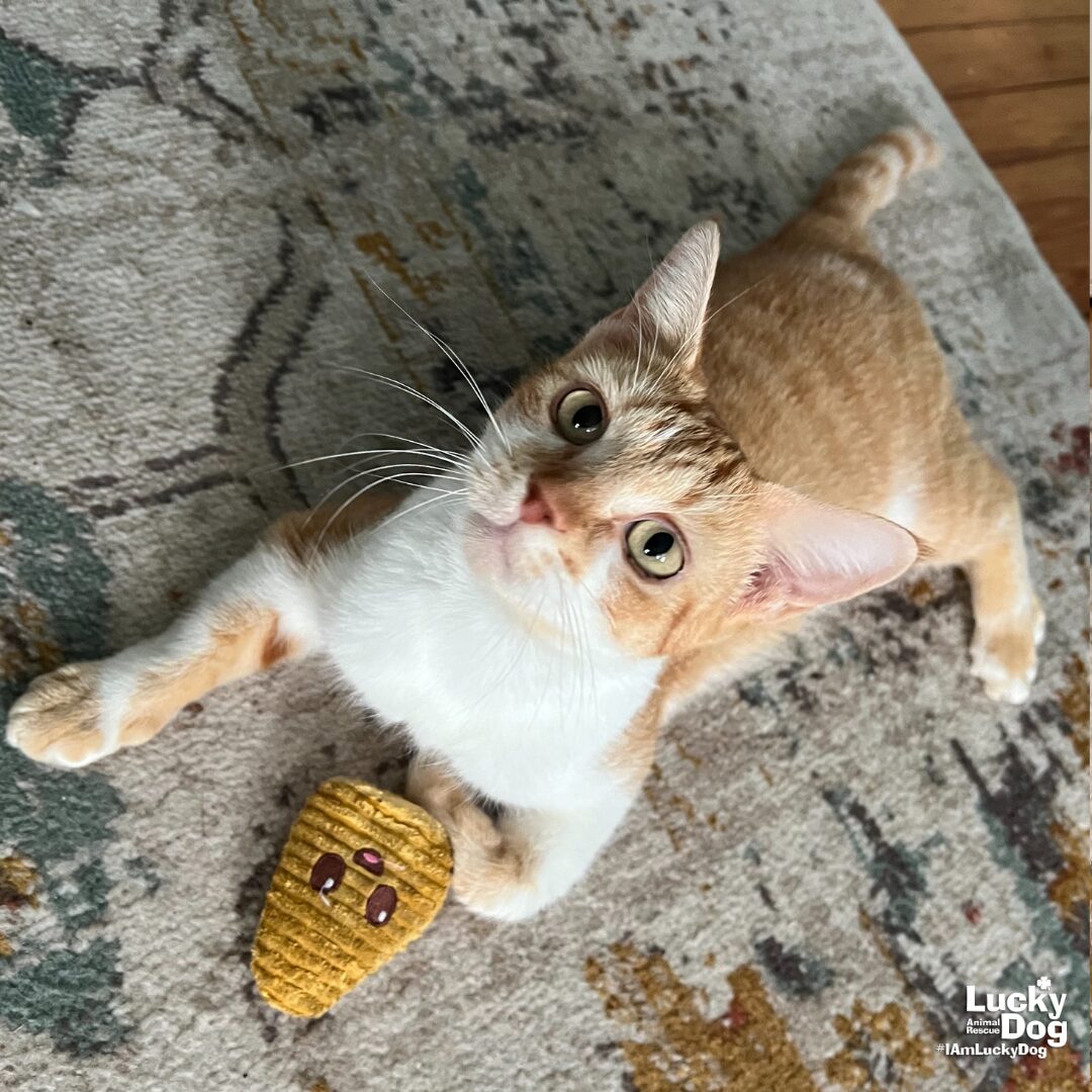 Please contact Jessie Cheng (jessie.cheng@luckydoganimalrescue.org) for more information about this pet.Sweet mama looking for a forever home!BIRDIE NEEDS A FOREVER HOME!!!! COME MEET BIRDIE AND OTHER GREAT ADOPTABLE CATS ON SUNDAY 12/21 FROM 12PM-3PM AT THE PETSMART IN FALLS CHURCH (6100 ARLINGTON BLVD, FALLS CHURCH, VA)! Name: Birdie Best Guess for Breed: Domestic Short Hair Best Guess for Age: 2 years – Est. DOB: 9/4/23 SEX: Female Approximate Weight: 7.58 lbs as of 9/4/25 Coloring: Orange Tabby & White Type of Hair: Short Gets Along With: With proper integration, Birdie will likely get along with other cats, dogs and kids with an acclimation period. We’re happy to help with tips and tricks! Currently Living at: Foster home in the DC area! Check out our sweet mama cat, Birdie, playing with her toy! I am Looking For: My loving forever family! Hi! I’m Birdie and lots of toys so I can run and play and be my sweet self. I just finished raising my kitten and can’t wait to enjoy being a young cat myself. What My Foster Says About Me: (10/30) Birdie is a friendly, easygoing kitty. She loves to rub up against your legs and get a head scratch. Like the mama cat that she is, she’ll want to give you a little groom with her tongue. She’ll also give you a little chirp when she wants to say hi! Birdie loves chasing a ribbon toy — she particularly loves one that moves like a bird and has a feather at the end — and she also enjoys playing with a kicker toy. When it’s not playtime, she’ll happily curl up for a nap or watch birds on the windowsill. She’s slowly meeting our resident cat and dog, and has done well with both! TO ADOPT: The adoption fee for adult cats is $200 ($350 for two cats adopted together). The adoption fee for a kitten (under 7 months old) is $220 ($380 for two kittens adopted together).If you are interested in adopting, please complete the Adoption Questionnaire online at bit.ly/adoptaluckycat. Lucky Dog Animal Rescue does our best to provide accurate information about the cats we have for adoption. That said, we cannot make any guarantees about age, breed or temperament. Thank you for contacting Lucky Dog Animal Rescue and helping to save a life! Please visit us online at www.luckydoganimalrescue.org . BE A FOSTER!!! Fosters make it possible for Lucky Dog Animal Rescue to save and care for homeless and abandoned dogs! To learn about fostering, please contact fostering@luckydoganimalrescue.org BE A SPONSOR!!!! Sponsors help Lucky Dog support the many dogs we save. To learn more about sponsorship, please contact info@luckydoganimalrescue.org !