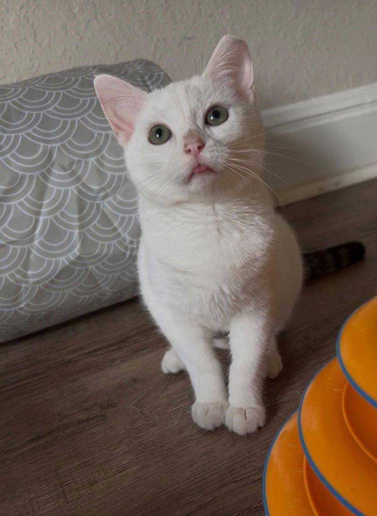 Hi! I’m Biscuits, a young lady with gorgeous eyes and silky fur who purrs loudly as soon as I’m petted! My favorite activities include climbing up cat trees to see the world from up high and diving into boxes to discover hidden treasures. I’m a bit shy at first, but give me a little time, and I’ll be your sweet, friendly companion. I’m curious about everything around me and so gentle when we play. If you’re looking for a loving friend who’s always ready for a gentle cuddle or a playful adventure, I’m the perfect kitten for you. Let’s explore the world together!To inquire about adopting this cat please complete an adoption application at tinyurl.com/ccapadoptions Once you submit an adoption application, a foster will reach out within 48 hours to schedule a meet-and-greet or ask any additional questions. If you haven’t heard back within that time, please contact **adoptions@sanantonioferalcats.org** so we can follow up. If the cat you’re interested in isn’t listed in the dropdown menu, it may be pending adoption or recently adopted, but the website hasn’t been updated yet. Feel free to email us for confirmation. Thank you for choosing to adopt one of our amazing cats!