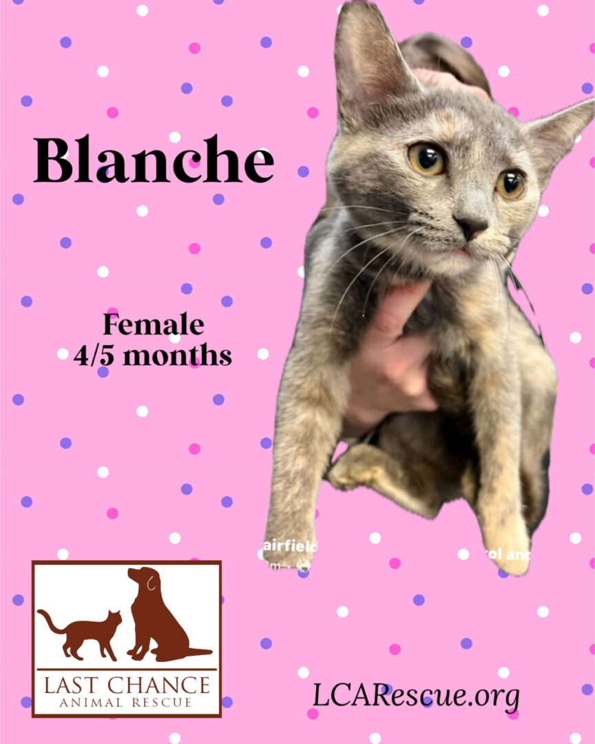 See BLANCHE’s HomepageGo to our official websiteYou can fill out an adoption application online on our official website.Meet the Golden Girls Litter Momma Edna and her 4 daughters Rose, Blanche, Dorothy, and Sophia are coming to NY for the next step in their lives. These girls were found on the side of the road in SC in a wire crate, the girls are all 4-5 months old and Momma is now expecting some more kitties and is about to pop any day now. They are all hoping to find their forever homes. This baby is spayed/neutered, UTD on vaccinations, is FIV and FeLV/Feline Leukemia Negative, and ready to find a soft spot to land and enjoy a family! we are a foster based organization located on Long Island, NY. We do out of state adoptions within a reasonable distance. Please visit LCARescue.org for an application or more information!