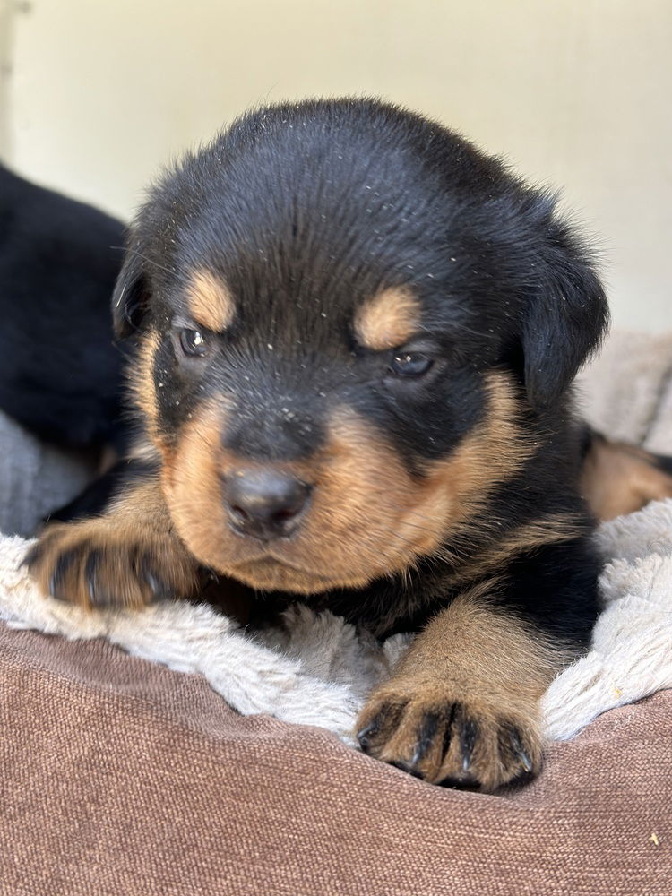 **Meet Blaze!** He is an adorable purebred male Rottweiler puppy born on February 17, 2025. Blaze's parents, Sol and Luna, are also part of our rescue, and we can assure you they are both sweet and loving dogs. Blaze will be ready for his forever home when he turns 8 weeks old, and we are currently accepting applications for him and his brothers. We will carefully select the application that we believe is the best fit for Blaze!At just over 3 weeks old, Blaze has just opened his eyes, and we are excited to watch his personality develop day by day. With a big blocky head like his dad's, Blaze is already looking like a cartoon character! His parents are stunning, and we expect Blaze to grow into a handsome Rottweiler just like them.**Our Adoption Process:** If you're interested in bringing one of our fun-loving, not-so-rotten Rotties into your home, we ask that you complete our questionnaire. This helps us understand your family and lifestyle to ensure the best match for you and Blaze. You can find the questionnaire on our website at www.rottenrottie.com under the forms tab. Once we’ve reviewed your application, we may recommend another Rottweiler if we feel it's a better fit. After determining the perfect match, we’ll arrange a meet-and-greet at the dog’s home to see how they interact in a comfortable environment. A home check will be required to ensure Blaze goes to a safe and loving home. An adoption contract will need to be signed, along with a rehoming fee of $500 for most adults and $400 for seniors (6 years and older) or Rottweiler mixes of any age (excluding puppies). The fees for puppies like Blaze will vary based on the investment we’ve made in their care and whether they are purebred or mixed. These funds are crucial for our organization to continue rehoming Rottweilers.Rest assured, all our dogs are sterilized, fully vaccinated, microchipped, heartworm tested negative, and come with a collar and leash. We also address any injuries or illnesses they may have had upon arrival or during foster care, and we will disclose these to adopters beforehand.**Please Note:** We generally do not adopt our dogs to individuals living in different states..Get ready to welcome Blaze into your heart and home! **Apply today!**
