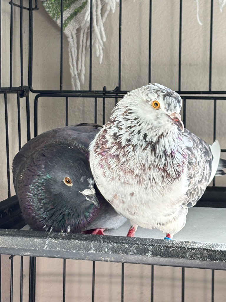 Sweet Bonk was lucky to be found and rescued in a backyard in Oakland. Her rescuer quickly recognized that she needed help and got her to Palomacy. She had a wound on her scalp that required three stitches. She has fully recovered and has married Buddy Bighead. they are an amazing couple who would love to be house pigeons although could easily live in an aviary. These two are extra people curious.Please apply to adopt http://www.pigeonrescue.org/birds/apply-to-foster-or-adopt/