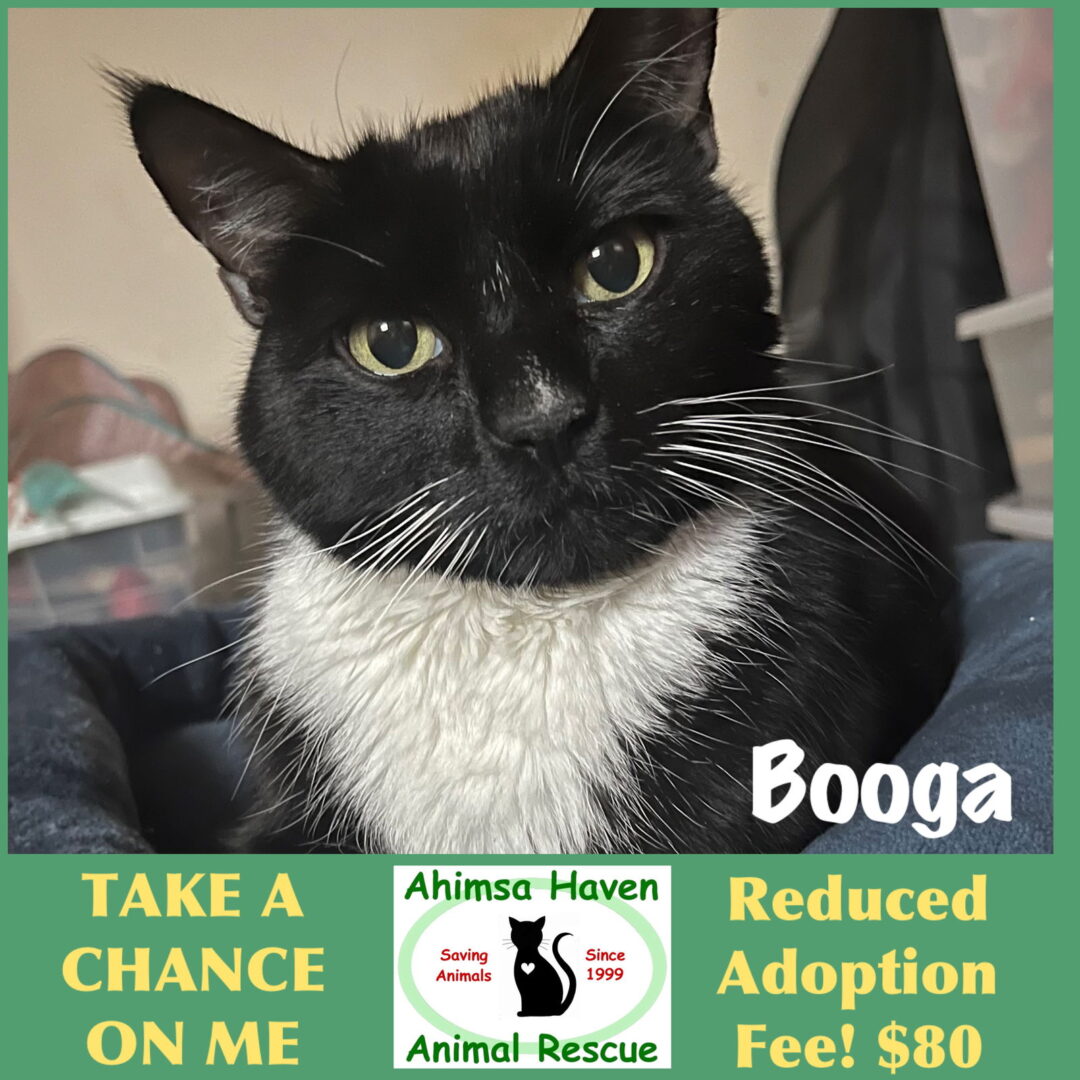 Hi, my name is Booga. I’m a mature 13-year-old gentleman. I came to the shelter as a diabetic, but with proper nutrition and excellent care, I’ve gone into remission and no longer need insulin. I love snuggling with my people, enjoying belly rubs, playing with shoelaces, and relaxing in my favorite cozy kitty bed. I’m part of the Take A Chance On Me program, which means my adoption fee is lowered to help me find the right match. If you are interested in adopting, applications can be found on our website www.ahimsahaven.org. Meet and greets are with an approved application by appointment only. As always, cats that are ready to be adopted are spayed/neutered, have age appropriate shots, are micro-chipped, dewormed/deflead, and FEL/FIV tested.
