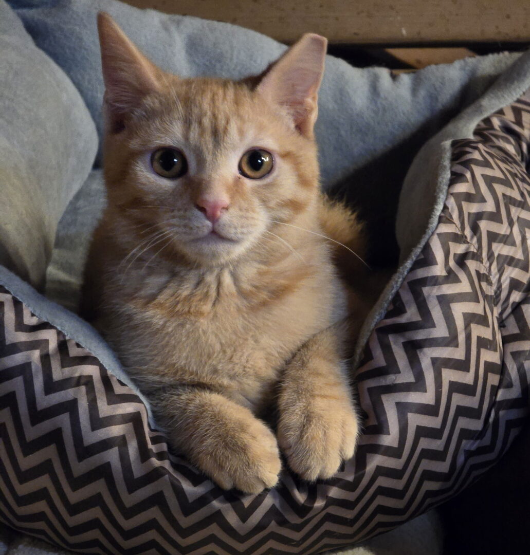 See Brady’s HomepageGo to our official websiteYou can fill out an adoption application online on our official website.Estimated DOB: 8/7/25 Meet Brady Brady is a sweet orange tabby with a story of incredible resilience. This little guy was once destined for euthanasia at a high-kill shelter, but thanks to a timely call and the help of Proverbs, Brady was given the chance he so deeply deserved. As a tiny, frightened 4-week-old kitten, Brady reacted out of fear and bit his finder, which nearly sent him down the path of being placed as a barn cat. To make matters harder, he then received an erroneous false-positive test for feline leukemia. Thankfully, a proper confirmatory test was performed and revealed that Brady is negative for both FIV and Feline Leukemia. Despite everything he’s been through, Brady has blossomed into a playful, loving kitten. Once he feels safe, he melts right into your arms, purring nonstop and soaking up affection. He truly is a little lovebug at heart. Brady will need a patient, understanding home where he’s given the time and space to show his gentle personality. He also needs another kitty around his age to help him feel confident and keep him engaged. For his safety, Brady must be an indoor-only cat, as he may run if frightened. This brave little survivor has already overcome so much in his short life. With patience, love, and a feline friend by his side, Brady will make a devoted and rewarding companion.Brady is bonded with his foster sibling, Sampson. They must be adopted together. Adoption fee: $150. Adoption fee for two kitties: $225 Brady is neutered, microchipped, up to date on age appropriate vaccinations and negative for Feline leukemia and FIV.