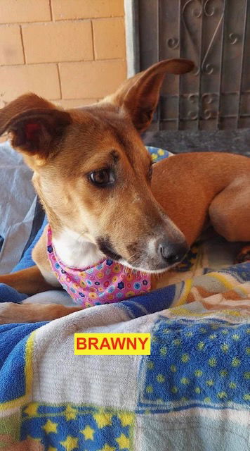 Brawny is a mix breed ( maybe greyhound/lab mix). She has long legs. She is about 3 yr old, weighs about 25 lbs. She is vaccinated, spayed and will be microchipped for adoption. She is friendly with dogs, cats and people.