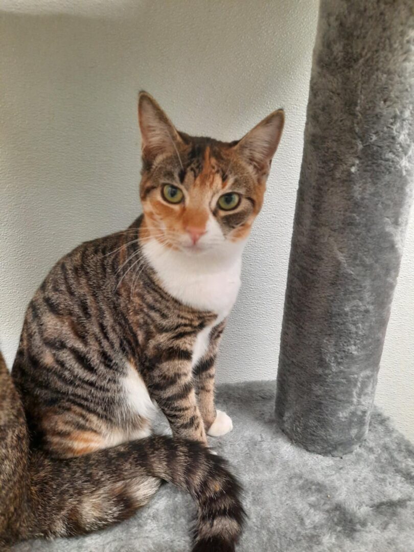 Brigid – Female DOB 4/30/2024 Domestic Short Hair – Calico Tabby Zora and Brigid are a beautiful pair of young sisters who rely on each other for comfort and confidence. While they’re both a little shy at first, they love being pet and will thrive in a home where they can settle in at their own pace. Zora, with her striking marbled black and gray coat, white paws, and two tiny white tufts under her nose, is the more outgoing of the two. She warms up quickly to gentle affection and helps her sister feel more secure. Brigid is a stunning tricolor girl who’s a little more cautious. When you first approach her, she may let out a small hiss—it’s her way of saying, “Please go slow.” But once you pet her face and chin, her purrs will let you know she’s enjoying the attention. She also loves slow, full-body pets but can get startled if you pull your hand away too fast. Once she's done with wanting pets, she will let you know with a quick little love bite to your hand. These sisters are happiest together and would do best in a quiet, dog-free and kid-free home. They’re comfortable around other cats and will thrive with someone patient who understands their need for a calm and steady environment. If you’re looking to celebrate the holidays by adding two sweet, unique kitties to your family, Zora and Brigid might be just who you’re looking for. Please apply via our easy online application at https://furrr.org/cat-adoption-process/All kitten(s) and cat(s) at FuRRR Feline Rescue are spayed/neutered, up to date on vaccinations for their age, combo tested for FIV/FeLV, microchipped and have a Health Certificate from a licensed NH veterinarian. Our application is available to be completed online at https://furrr.org/cat-adoption-process/ Applying DOES NOT guarantee approval. We hold meet and greets with approved applications only. (Kittens are available for adoption in pairs only unless they are going home to another kitten or young cat under 3) Our policy is strictly NO DECLAWING and INDOOR ONLY. Adoption fees: Kitten to 1 yr – $300 Kitten pairs $550 Adult cat 1+ yr to 8 yr – $200 Adult pairs $350 Cat 8+ – $75