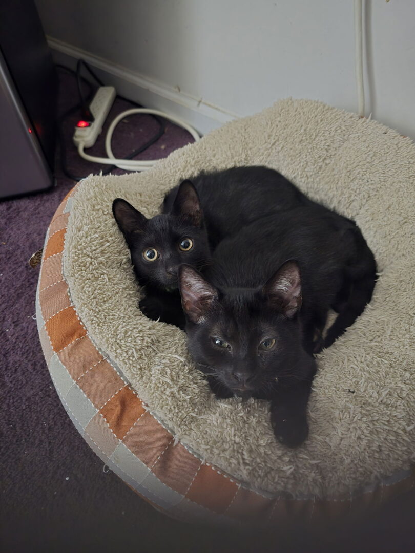 Bonded Pair: Buddy and Jaxon. Buddy and Jaxon are brothers, approximately 5 months old. They also have a sister named Binky (FCID# 08/19/2025 – 110). Buddy (FCID 08/19/2025-108) and Jaxon (FCID 08/19/2025-109) are a bonded pair. They eat together and sleep together. Jaxon seems more timid out of the 3, but the moment you put down food, he’s all there. They love to be petted, but they get antsy when you pick them up. They are affectionate when you do pet them and love the attention. They are good with other cats and seem curious about our dog which is a Lab /Rottweiler. Buddy and Jaxson are playing with their foster family. Please submit a no-obligation application for a meet and greet to adopt today: https://forgottencats.org/adoption-application/. (Foster: Dina and Jim B.)