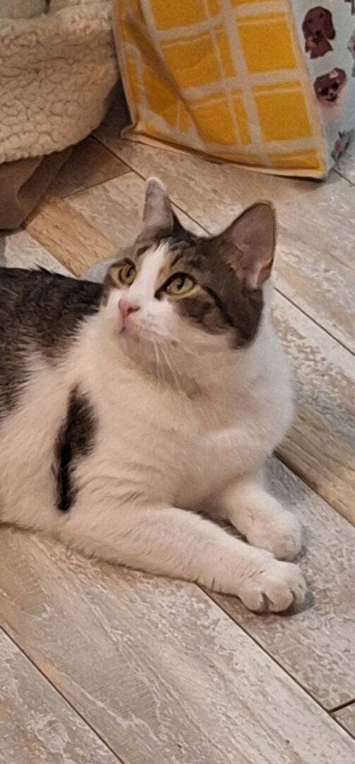 BUN BUN is a love bug that enjoys her people and snuggling! She adores the attention of volunteer caregivers at Animal Advocates, often jumping into caregivers' arms or laps as soon as she has the opportunity. Bun Bun chirps and prances around, waiting "patiently" for head scratches and treats. We surmise Bun Bun would do well in most home environments with a family to give her all of the love and attention she craves! Bun Bun previously resided comfortably with other felines and dogs. She is currently the resident 'shop cat' at the Animal Advocates Thrift Shop – greeting guests Monday-Friday 12-3pm and Saturday 12-4pm (35 Wabash Street, Pittsburgh PA 15220). Bun Bun has plush white fur spotted with brown tabby patches. Her birthday is approximated to be early 2022. She has tested negative for Felv/FIV, up-to-date on vaccinations, spayed, microchipped and treated for fleas/dewormed. If you are interested in adopting a cat, the first step is to complete an online application located at www.animaladvocates.net (under the "Adopt" menu). Thank you for considering a rescue cat from Animal Advocates!