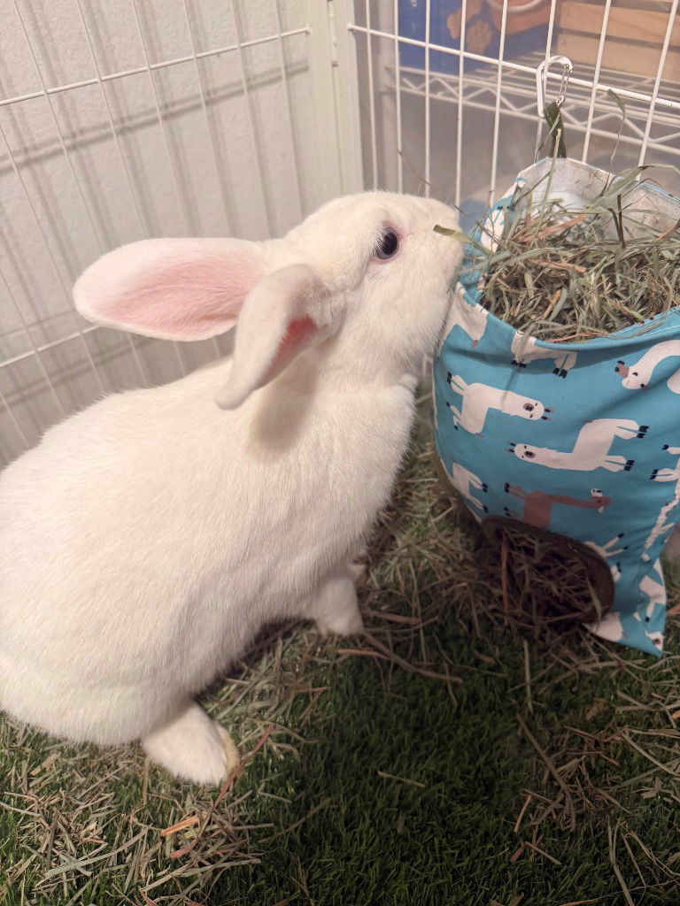 Casper: What a sweetheart. Casper has lovely white fur and the most beautiful, blue eyes. He is Very friendly and sweet. He likes to have a job and his favorite thing is to take care of other bunnies. He would be easy to bond with any rabbit. He likes to be included. He’s the type of bunny you can watch TV with and take anywhere. Casper is used to cats and small dogs (~up to 20lbs). He likes to play with them (supervised!). He’s not afraid of a vacuum. He’s not afraid of anything. He’s a very confident boy. He likes to sit on your shoulder when you bend down to sweep his pen. He does great binkies!. He jumps out of his x pen when he feels lonely or adventurous – He wants to be included in what everyone else is doing. Oh, he is neutered, vaccinated and microchipped. DOB 9-27-23