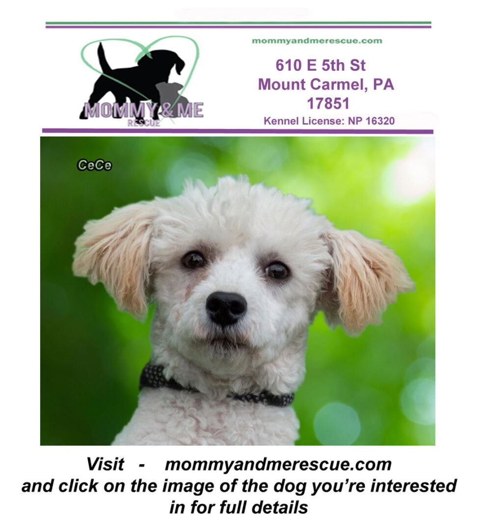 See CeCe’s HomepageGo to our official websiteYou can fill out an adoption application online on our official website.All adopters are required to meet at our rescue center in Mt Carmel, PA (no exceptions). Please EMAIL all questions to rescue.me.pa@gmail.com Please fill out an application here > https://mommyandmerescue.com/adoption-application/ and give your vet clinic permission to speak with us. Spayed/Neutered, UTD on vaccines, Chipped Adoption fee 400.00 You must submit the application and be approved prior to meeting one of our dogs. If you have questions please EMAIL rescue.me.pa@gmail.com or visit mommyandmerescue.com Kennel License: NP 16320 CeCe 1 yr old Bichon/Poodle Weight: 11 pounds CeCe is a shy but extremely loving and silly girl. She loves other dogs. CeCe enjoys going for walks and being held. CeCe would do best with older kids or no kids. She would prefer a quiet household that isn’t always busy. She would love to sit on a lap all day if she could. She is crate-trained and house-trained. License: NP 16320 PLEASE NOTE- we do not refund deposits if you change your mind. We are a PA licensed, 501C3 non-profit rescue. Visit our page for more information http://www.mommyandmerescue.com/