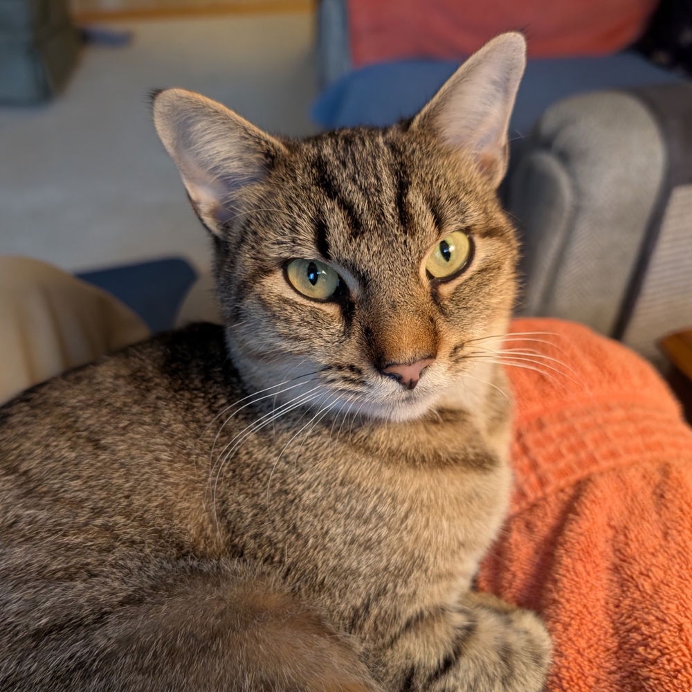 Pure and simple: Celine is a lap cat. She is friendly, outgoing and affectionate and there is nothing she would rather do than spend quality time in your lap! She is a beautiful brown tabby with large, alert gold eyes. She plays occasionally with toys, and her foster is not sure about other pets (because he doesn’t have any), but suspects she would get along fine with a friendly cat. She was living in an apartment complex with other cats. Celine is so social that she might get quite lonely if left home alone all day – a stay-at-home or work-at-home "pawrent" would be "purrfect" for this sweet girl.All cats are spayed/neutered, current on age-appropriate vaccines, FELV/FIV tested, microchipped, dewormed and started on monthly flea preventative.Meet Celine at PetSmart, Bleachery Blvd, during our weekly adoption event from 12-4pm on Saturday. All Mountain Pet Rescue (Asheville) animals are up-to-date on vaccinations, spayed/neutered and micro-chipped before adoption. Contact the foster parent or Mountain Pet Rescue at pets@mpravl.org for more information. Please note that visual breed identification of companion animals has been proven to be unreliable, so for most of our animals we provide a best guess at predominant breed or breed mix. We get to know each of our animals as an individual and do our best to describe and place pets based on personality not breed label. Mountain Pet Rescue is a 501(c)(3) non-profit tax deductible charity (EIN 82-3039637) located in Asheville, NC.
