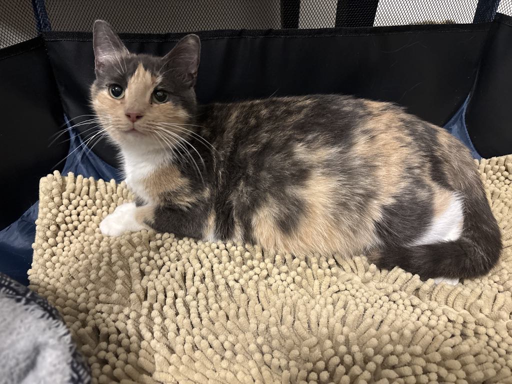 Purrmit me to introduce myself—I'm Cha-Ching, your resident feline treasure and the reigning queen of the Dollar Store rescue! I showed up here with a literal "cha-ching" in my belly—seven little nuggets of cuteness, also known as my kittens. Yep, I'm rich in love (and baby paws)! As for my purrsonality, I'm laid-back, loving, and oh-so-affectionate. I firmly believe that hands exist solely for petting (and maybe a gentle head scratch or two). I’m also a professional lap inspector, but right now, I'm still in full mama mode, so I don't stray too far from my mini meowsters. They're my stockpile of joy! I get along paw-sitively well with other cats—no hiss-teria here. I haven’t met the doggo yet, but I’m pawsitive I’ll charm them too. Each day, I make sure to greet my favorite human with a friendly meow and follow them around like the VIP they are. It's just my way of saying, "You're paw-some!" If you're looking for a laid-back cuddle bug who’s rich in charm and love, then Cha-Ching might just be the purr-fect match. After all, I've already hit the jackpot—you! Cha-Ching =^..^= , DSH Dilute Calico , Female , DOB 1/3/2024 Adoption Application – Cat Around Town Project