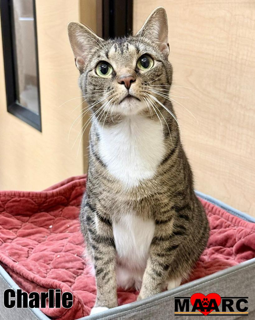 Charlie is a 2-year-old tabby and white boy who never quite got the memo that he’s not a kitten anymore. With boundless energy and a playful spirit, he’s always ready to chase a toy, explore every corner, or turn the simplest moment into a game. His zest for life is contagious, and he brings a fun, lively presence wherever he goes.Charlie is also a social butterfly—he gets along wonderfully with other cats and thrives in a home with friends to play with and bond with. His outgoing personality means he’s quick to make himself at home, greeting you with curiosity and confidence.If you’re looking for a cat who will keep you entertained, fill your home with energy, and happily be part of the action, Charlie is your guy.For more information on Charlie, contact Jenn at 865-599-7304 or apply at maarcadopt.org/adopt