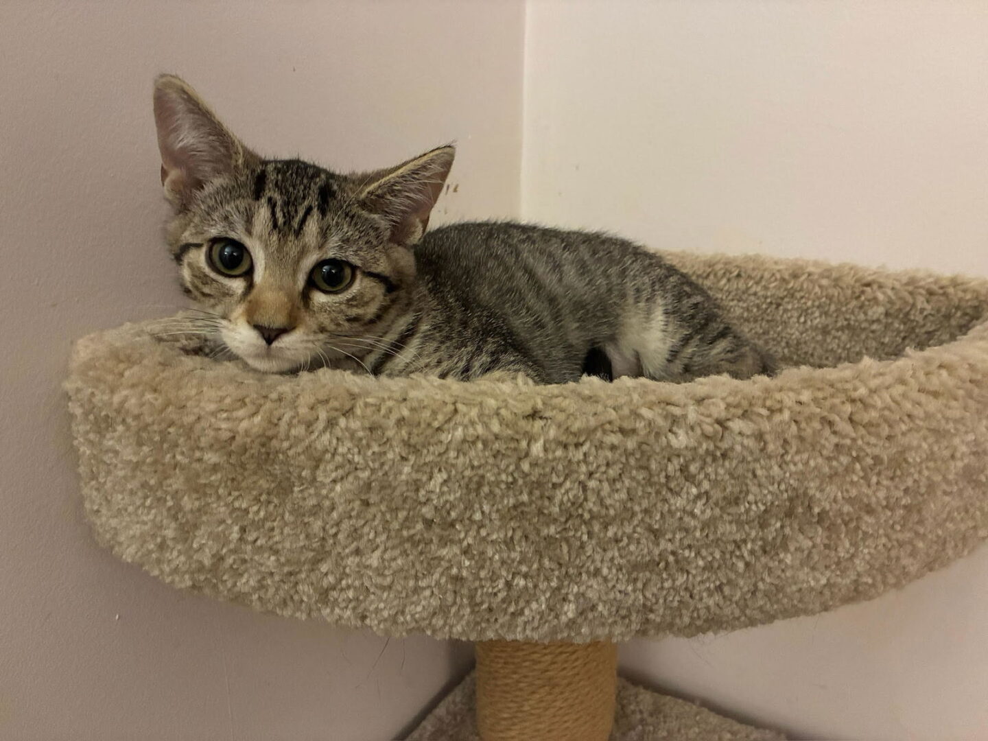 Please meet Charlotte! Charlotte (10/15/2025-41) is a three and a half-month old kitten who takes a few minutes to warm up to new people, but once she does, she can’t wait to play and receive pets. She loves toys that crinkle or that have ribbons or feathers for her to bat. Charlotte also has a good time wrestling and playing with her brother, Wilbur, and her sister, Fern. Charlotte is not on the move all the time, though, and her absolute favorite place to nap is at the top of her cat tree in the sun. She also becomes a purring machine when she’s being pet, and she’ll be sure to show you her spotted belly to say she is comfortable with you. Charlotte is great with using the litter box, and she enjoys both wet and dry food – as well as the occasional Churu treat. Please submit our no-obligation Adoption Application for a meet and greet or to adopt: https://forgottencats.org/adoption-application/. (Foster: Megan G.)