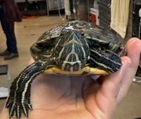 Hi there, I am a Red Ear slider. I like to swim and bask in the summer sun. While we start off small, we quickly grow in size with female of our king growing upwards of 12 inches! Because of large size we require 10 gallons per inch of shell (I.E 5inch turtle requires 50gallons). While we are aquatic turtles we also require a doc and and a basking light so we can lounge and dry our shells. We would be great addition to any pond as well! If you are interested in adopting, please visit www.spcamc.org/exotics to fill out an adoption application. Visite www.spcamc.org/exotics para completar una solicitud de adopción.